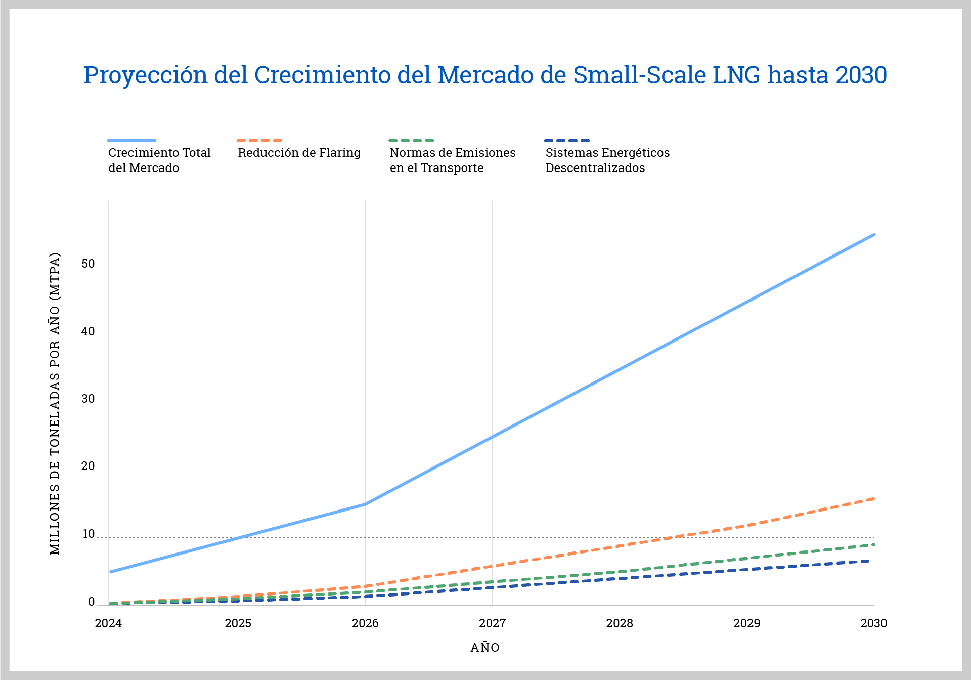 El mercado de GNL a pequeña escala está creciendo rápidamente. Las proyecciones sugieren que podría alcanzar entre 80-100 millones de toneladas anuales para 2030, impulsado por: