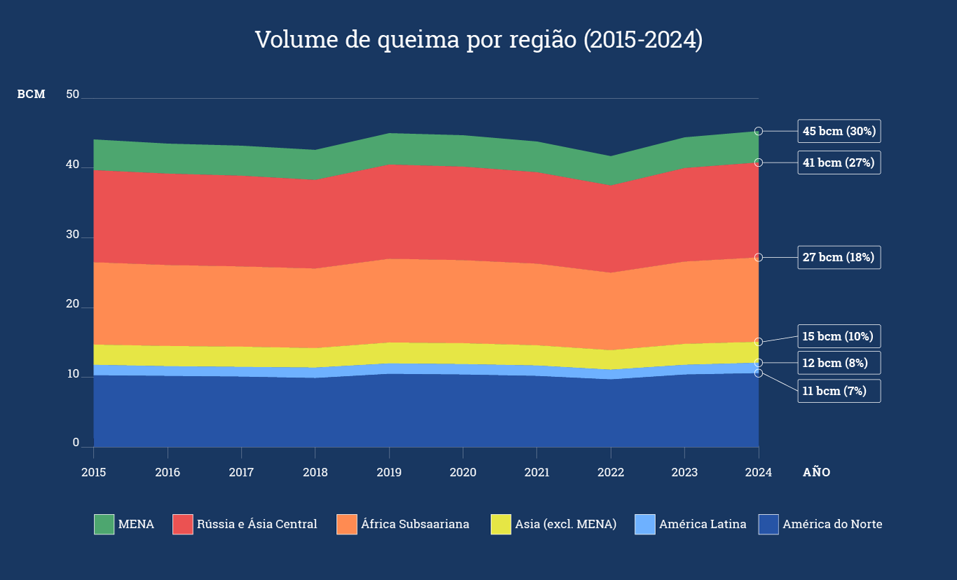 Os dados mostram tanto a magnitude do desafio (mais de 140 bcm/ano em todo o mundo, concentrados em poucas regiões) quanto o benefício potencial de sua mitigação: reduzir milhões de toneladas de emissões de CO₂ e metano, economizar bilhões de dólares e adicionar nova energia ao mercado.