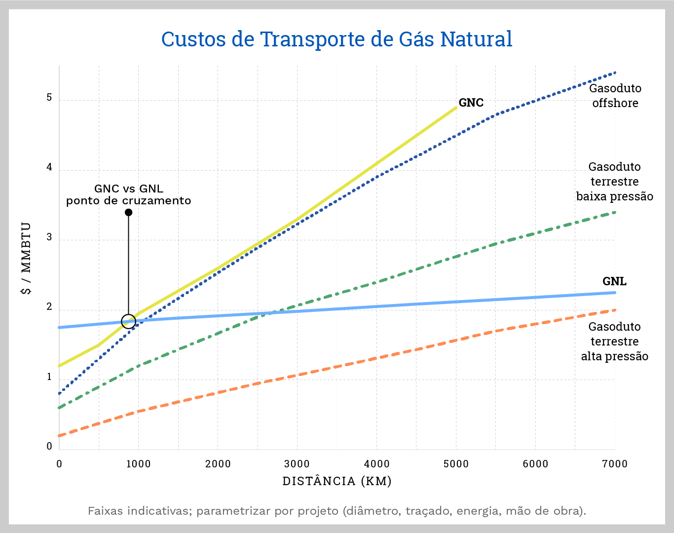GNC: Tende a ser a opção mais adequada para distâncias curtas a médias (tipicamente até ≈ 300 km) e quando a demanda é baixa ou moderada e distribuída em vários pontos. A reposição das unidades acompanha a curva de consumo sem a necessidade de infraestrutura criogênica.