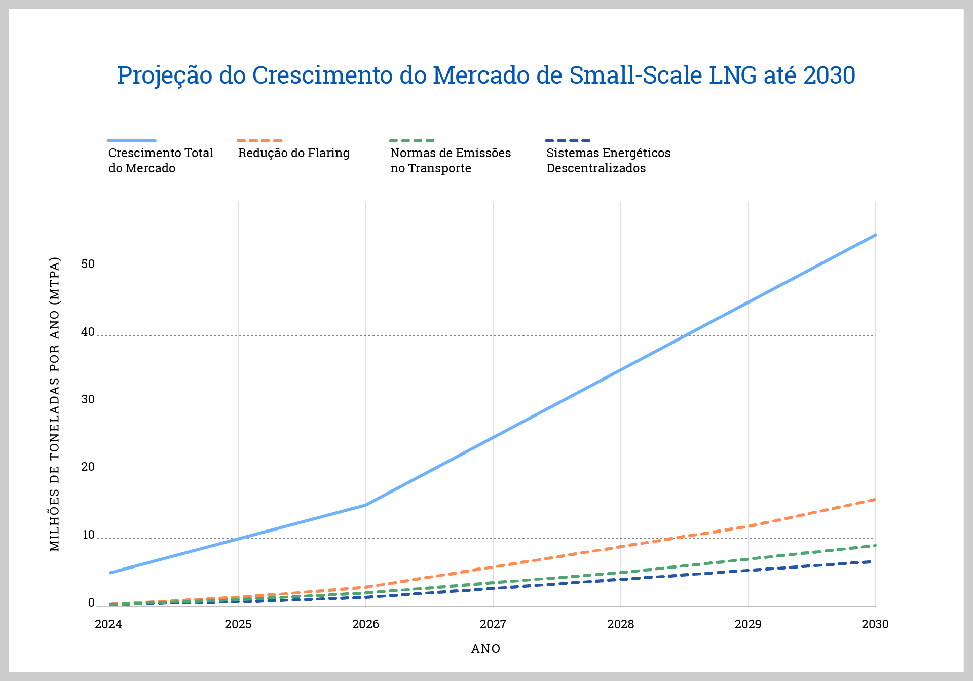 O mercado de GNL em pequena escala está crescendo rapidamente. As projeções sugerem que pode alcançar entre 80–100 milhões de toneladas por ano até 2030, impulsionado por: